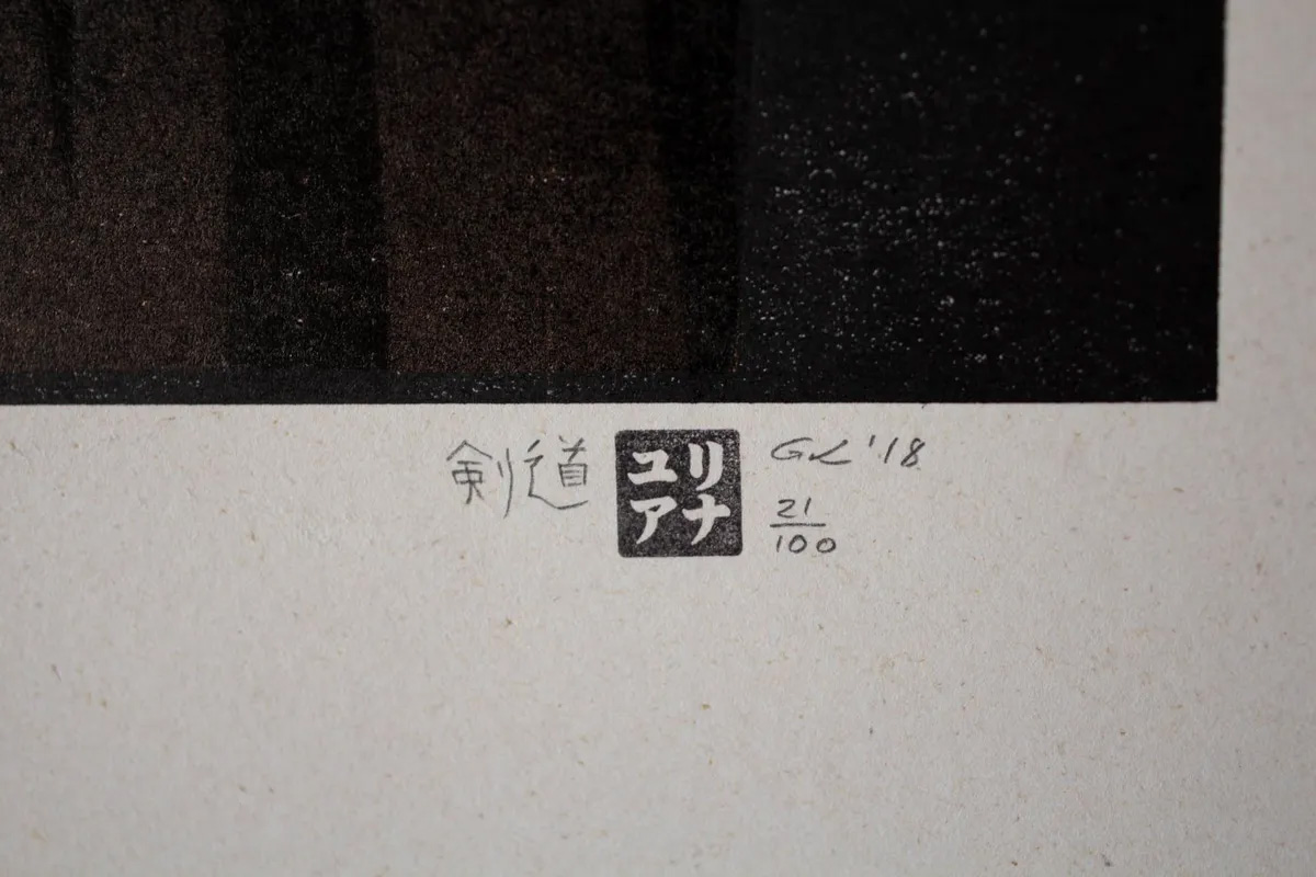 техника высокой печати, в которой гравёр вырезает изображение художника на "досках" из линолеума. Печатник накатывает краску на каждую "доску" и вручную отпечатывает каждый оттиск. Каждый оттиск в тираже нумеруется отдельно, что является гарантией уникальности и конечности тиража. При закрытии тиража доски уничтожаются. В данной работе весь процесс создания оттисков от изображения до печати был проведён автором самостоятельно.